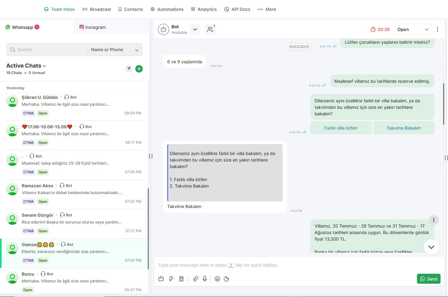 Villa kiralama hizmeti sunan Hemenkal firmamızın, Instagram reklamlarına tıklayarak whastapp yazışması yapan 4,250 müşterimizin sonuçlarını derledik. Yaklaşık bir aylık bir uyarlama sonrasında yazışmalarımızın %94'ünü başarıyla yanıtlamayı başardık.