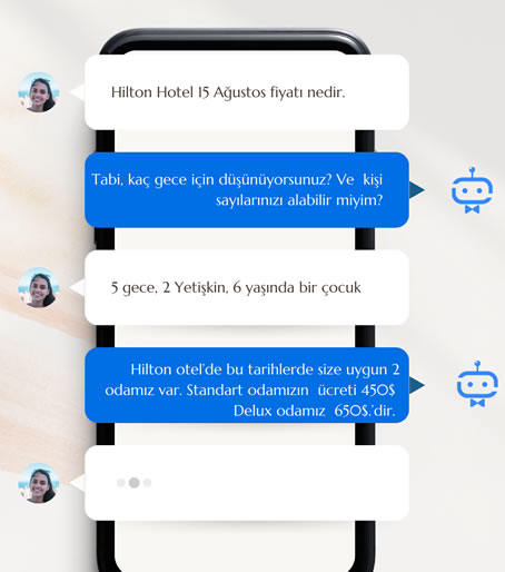 Travelrep, sizin için özelleştirilmiş bir çok bot ile müşterinin karşısına çıkar. Müşterinin ne hakkında soru sorduğunu anlayarak o konuya özel botları devreye alır. Bu özelleştirilmiş botlar müşteriye ve sorusuna özel, sisteminizden aldığı canlı bilgi ile beslenir.